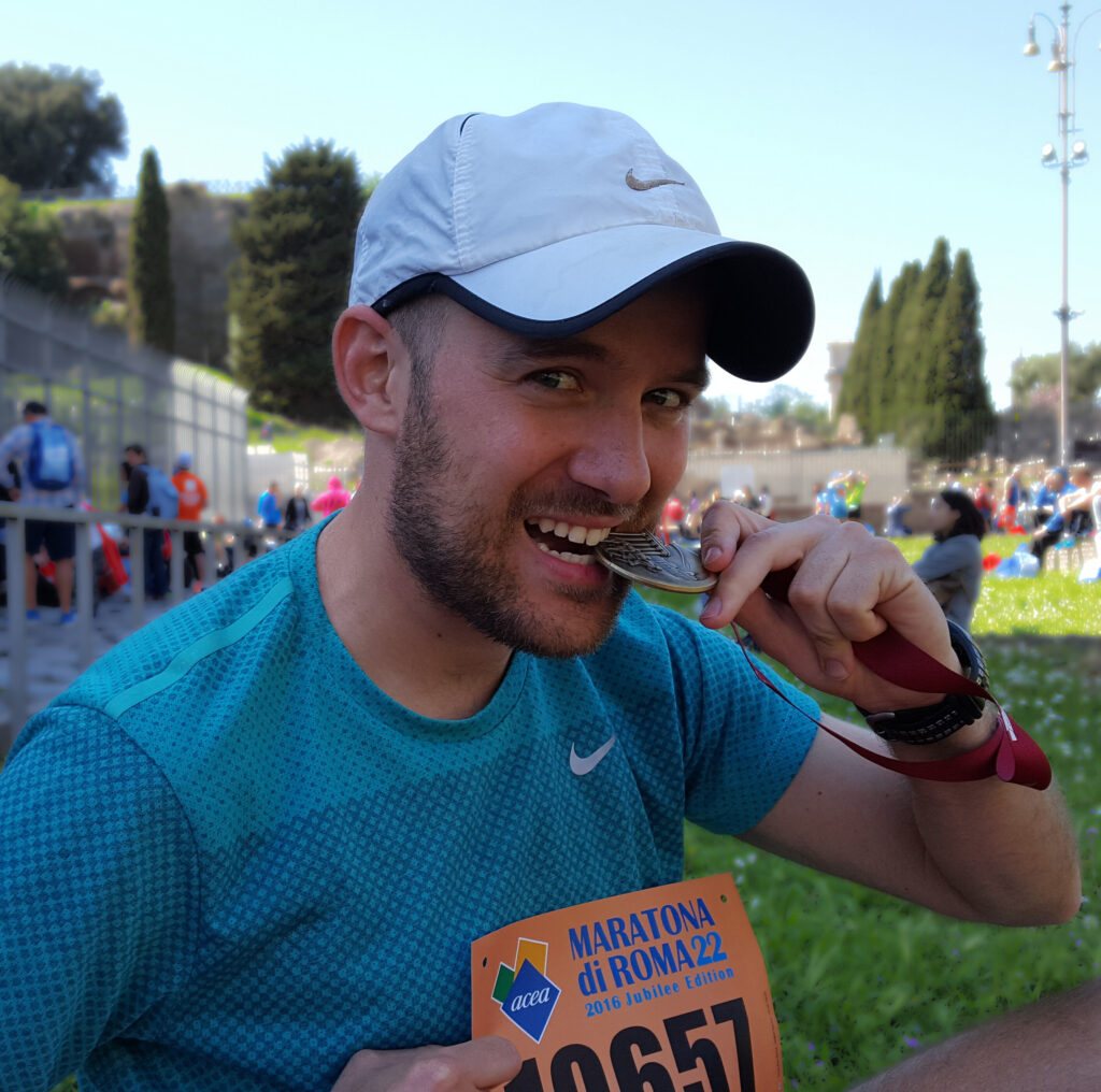 Aquí estoy en un maratón de Roma, con una medalla en la mano.